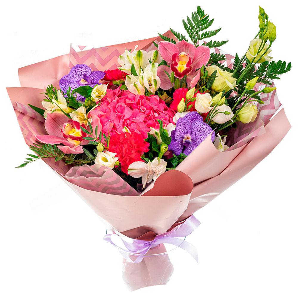 На фото представлен образец. Объем букета зависит от выбранного вами размера. Точное количество цветов и цветовую гамму вы можете уточнить у менеджера по телефону.
